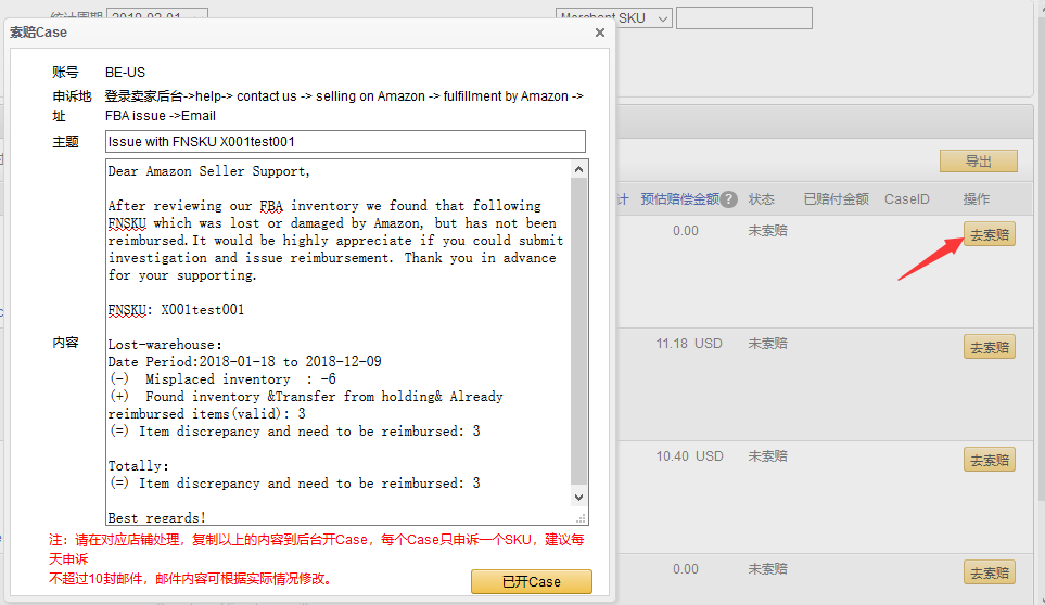 將顯示索賠郵件模板, 復制生成的郵件模板到亞馬遜后臺開Case,再點擊 “已開Case”。