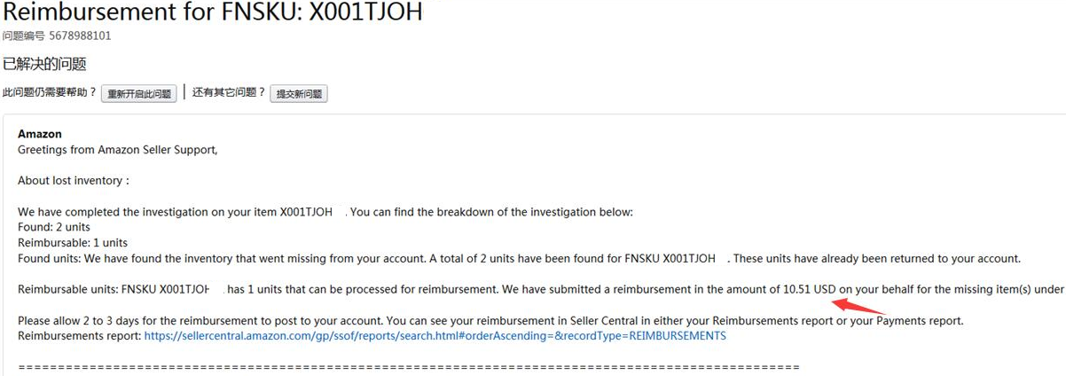 大概等一兩天就會收到亞馬遜的回復,亞馬遜確認后將把賠償返還到賣家賬號中,如下圖: