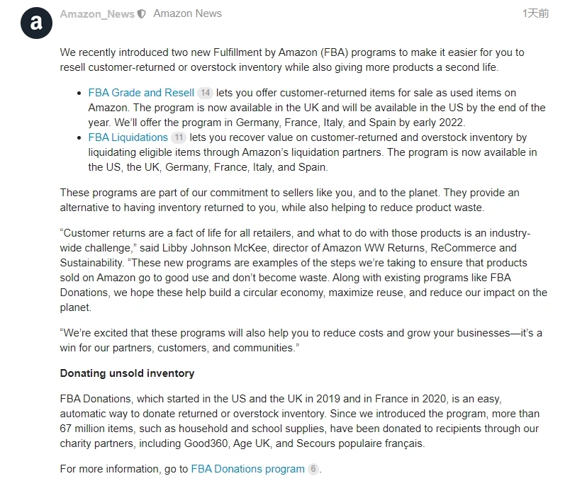 亞馬遜美國站最近發表了一則新公告,表示將推出兩項新的亞馬遜物流(FBA)計劃,方便賣家更為輕松地轉售買家退貨...